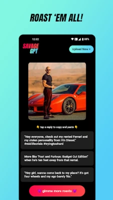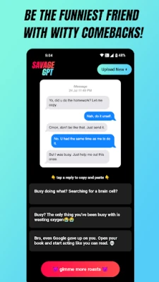 Upload Screenshots, Photos, Threads & More: Whether it’s a chat screenshot, Instagram post, TikTok comment, Twitter thread, Snapchat snap, WhatsApp message, Facebook status, or any image, SAVAGE GPT’s AI, powered by Gemini and ChatGPT, delivers unfiltered roast replies.