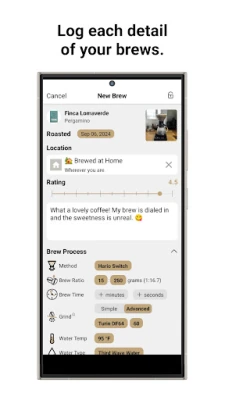 - Log and rate your brews - record the details of your brewing process (such as brewer, water to grounds ratio, brew time, and more), the flavors you are tasting, and scoring notes like a coffee professional.